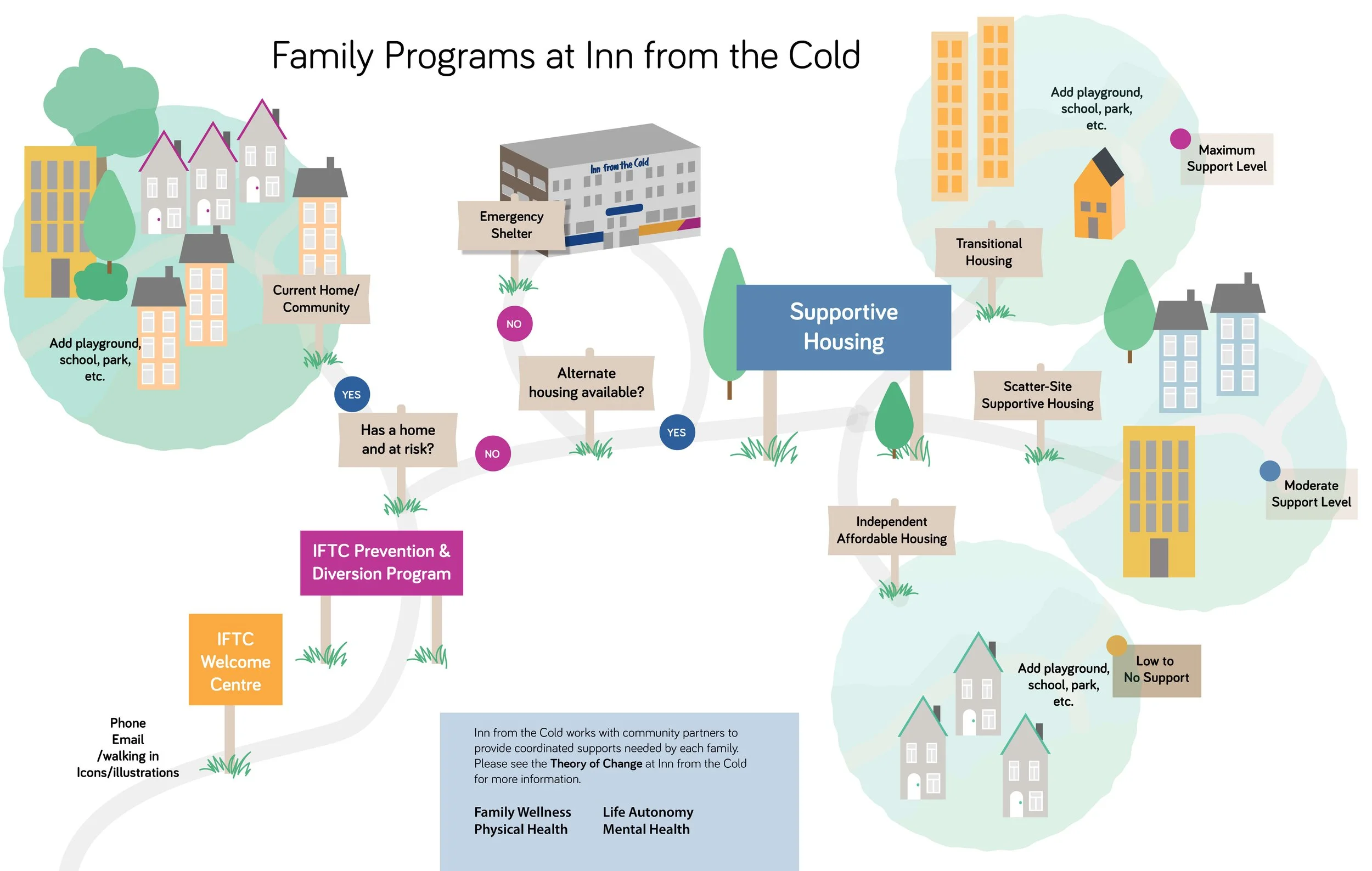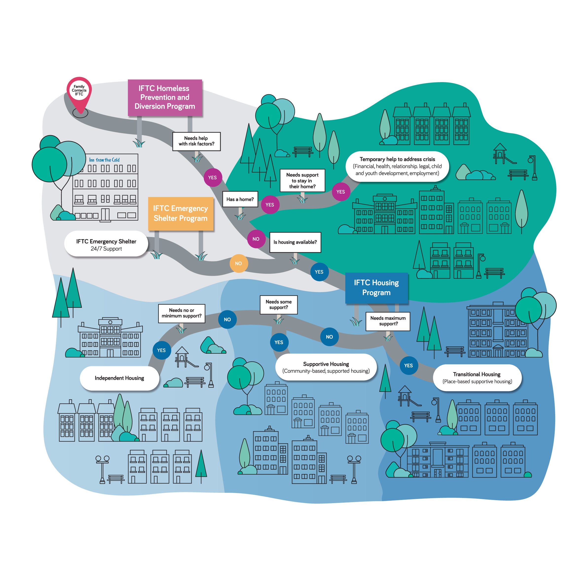 Navigate through this infographic and map that shows Inn from the Cold's vital programs. Starting from Prevention and Diversion, through Emergency Shelter, and the Housing Program, follow a guided path by answering simple yes and no questions. Gain insight into each program's purpose and learn how they provide support every step of the way.
